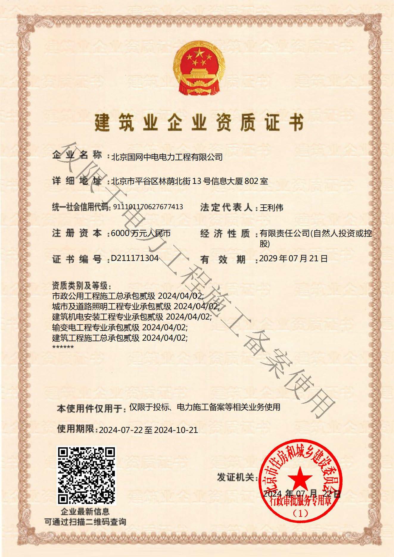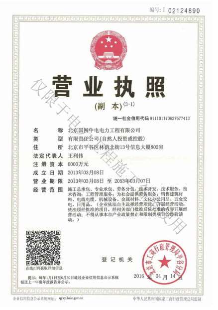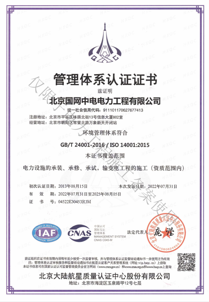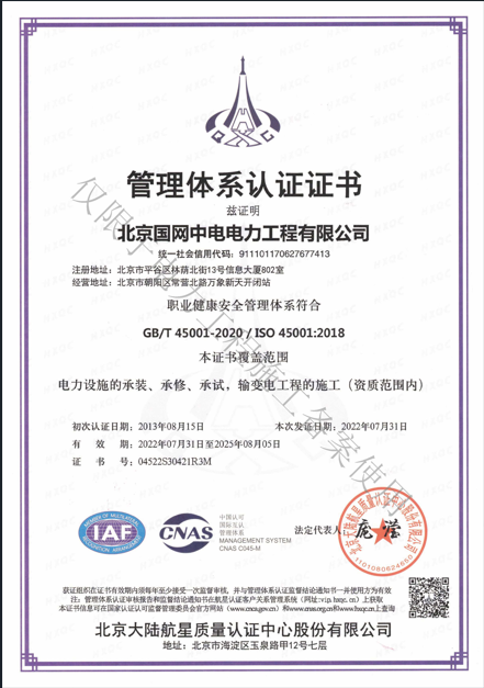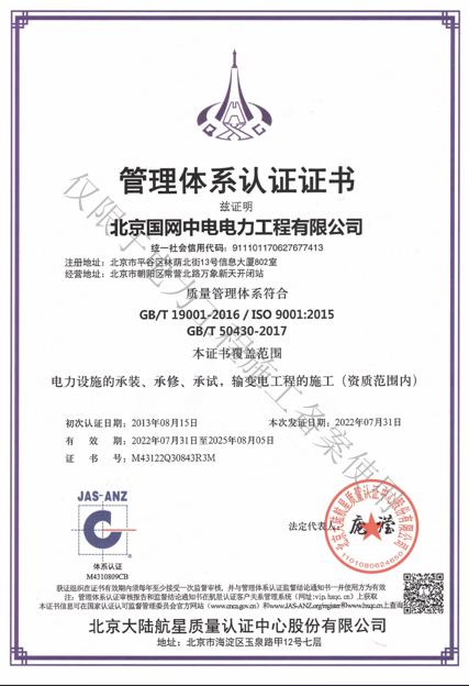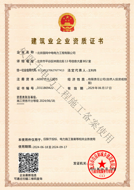 北京國網(wǎng)中電電力工程有限公司,已取得國家電監(jiān)會頒發(fā)的《承裝(修、試)電力設(shè)施許可證》、為電力施工承裝四級、承修四級、承試四級企業(yè)。北京市住房和城鄉(xiāng)建設(shè)委員會頒發(fā)的房屋建筑施工總承包二級、機(jī)電設(shè)備安裝工程專業(yè)承包二級、輸變電專業(yè)承包二級、城市及道路照明工程專業(yè)承包二級、市政公用工程總承包二級資質(zhì)、勞務(wù)不分等級,已通過ISO9001:2015 GB/T50430-2017質(zhì)量管理體系、GB/T24001-2016/ISO 14001:2015環(huán)境管理體系、